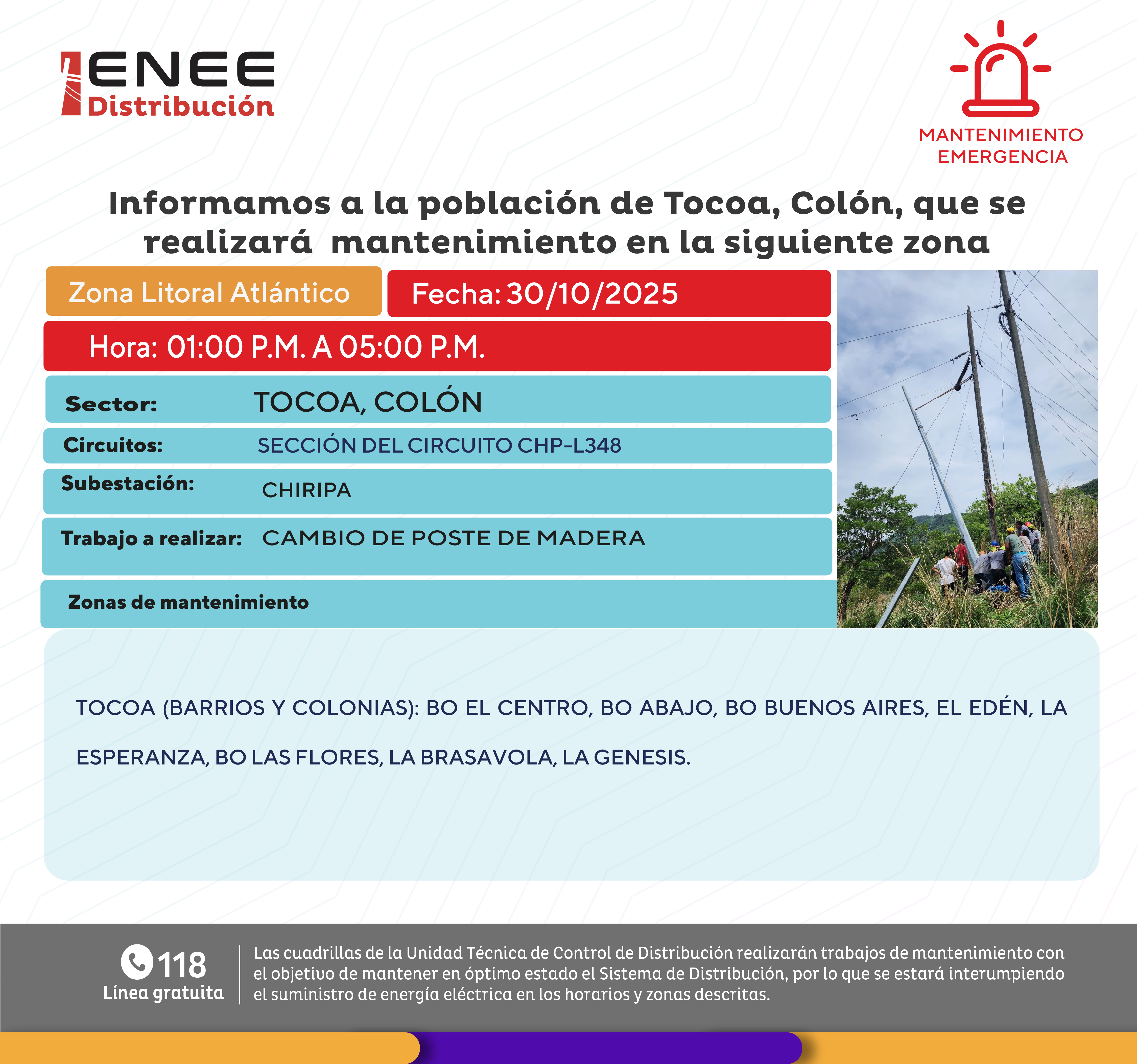 Avisos de Mantenimiento Emergencia - Litoral Atlántico Tocoa, Colón jueves 30 de octubre de 2025