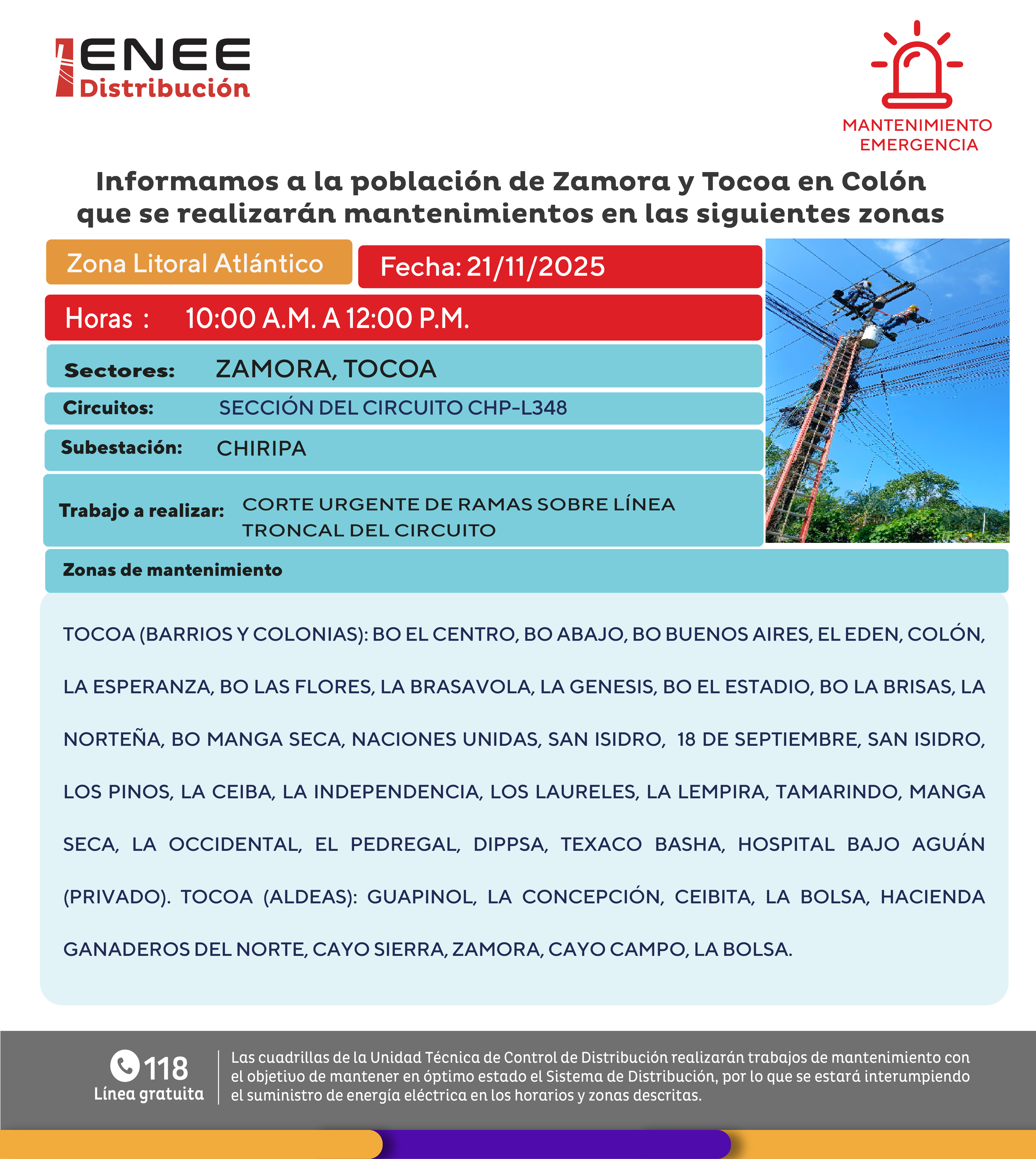 Avisos de Mantenimiento Emergencia - Litoral Atlántico Tocoa viernes 21 noviembre de 2025