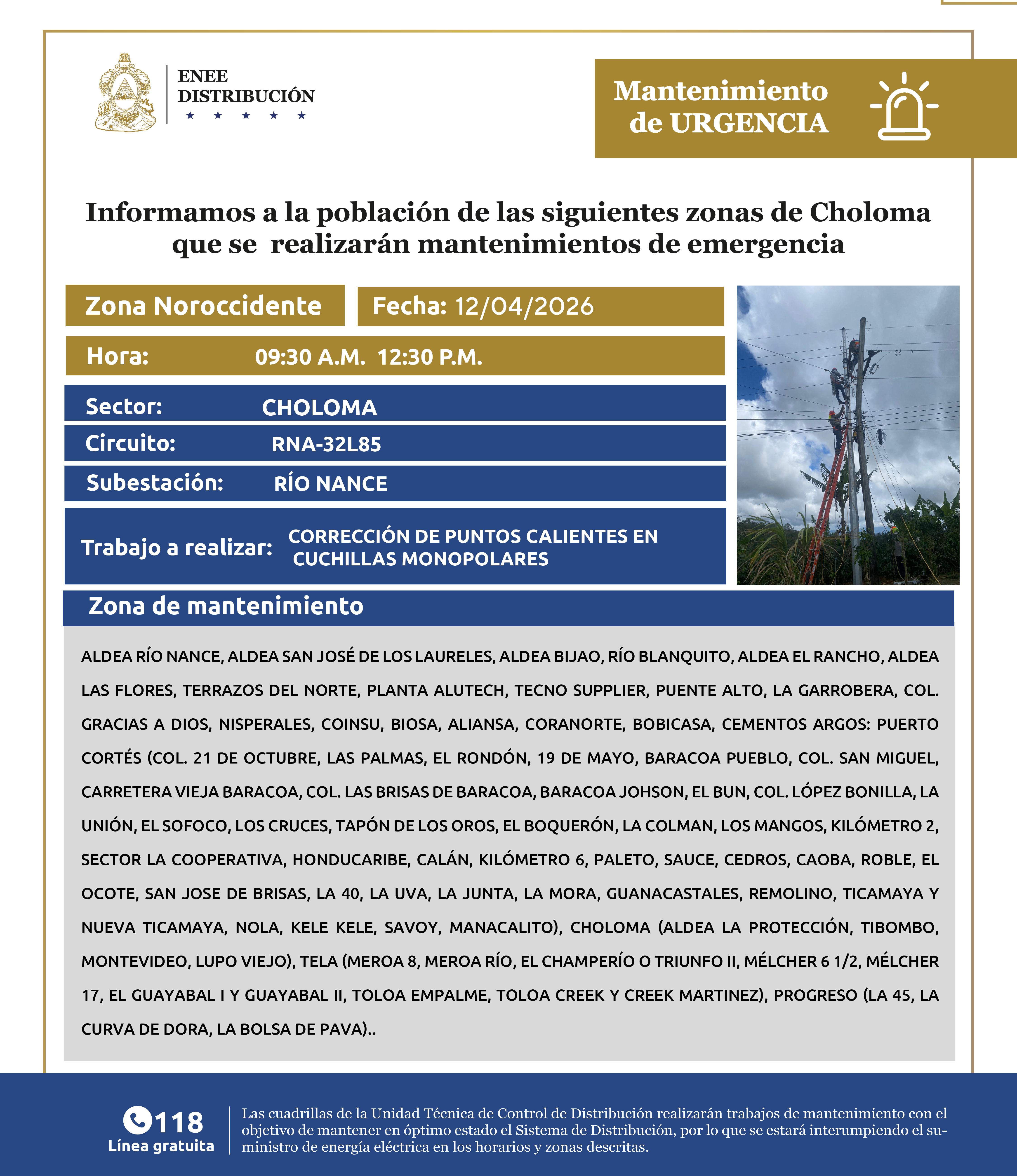 Avisos de Mantenimiento Emergencia - Noroccidente Choloma domingo 12 de abril de 2026
