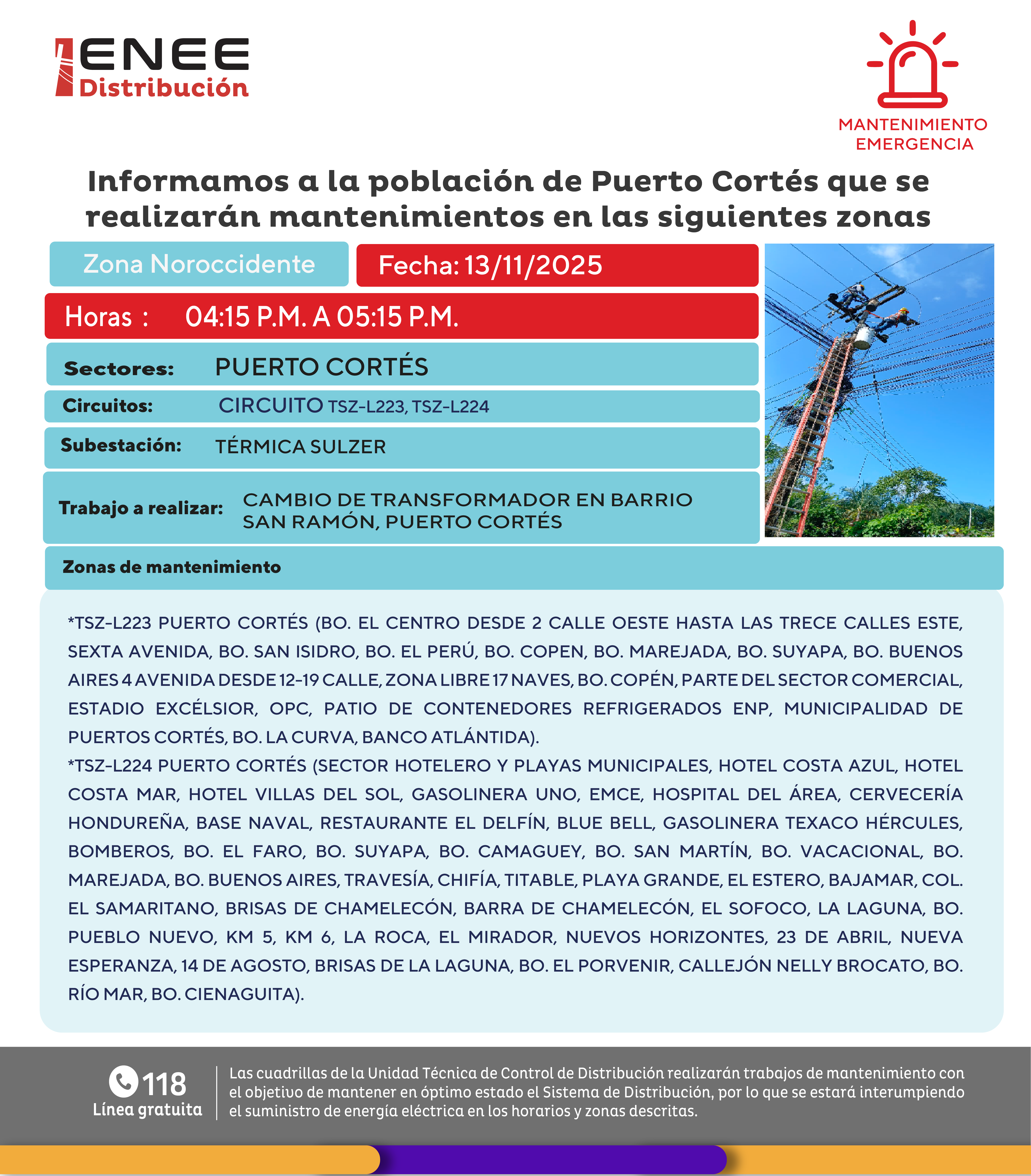 Avisos de Mantenimiento Emergencia - Noroccidente Puerto Cortés jueves 13 noviembre de 2025