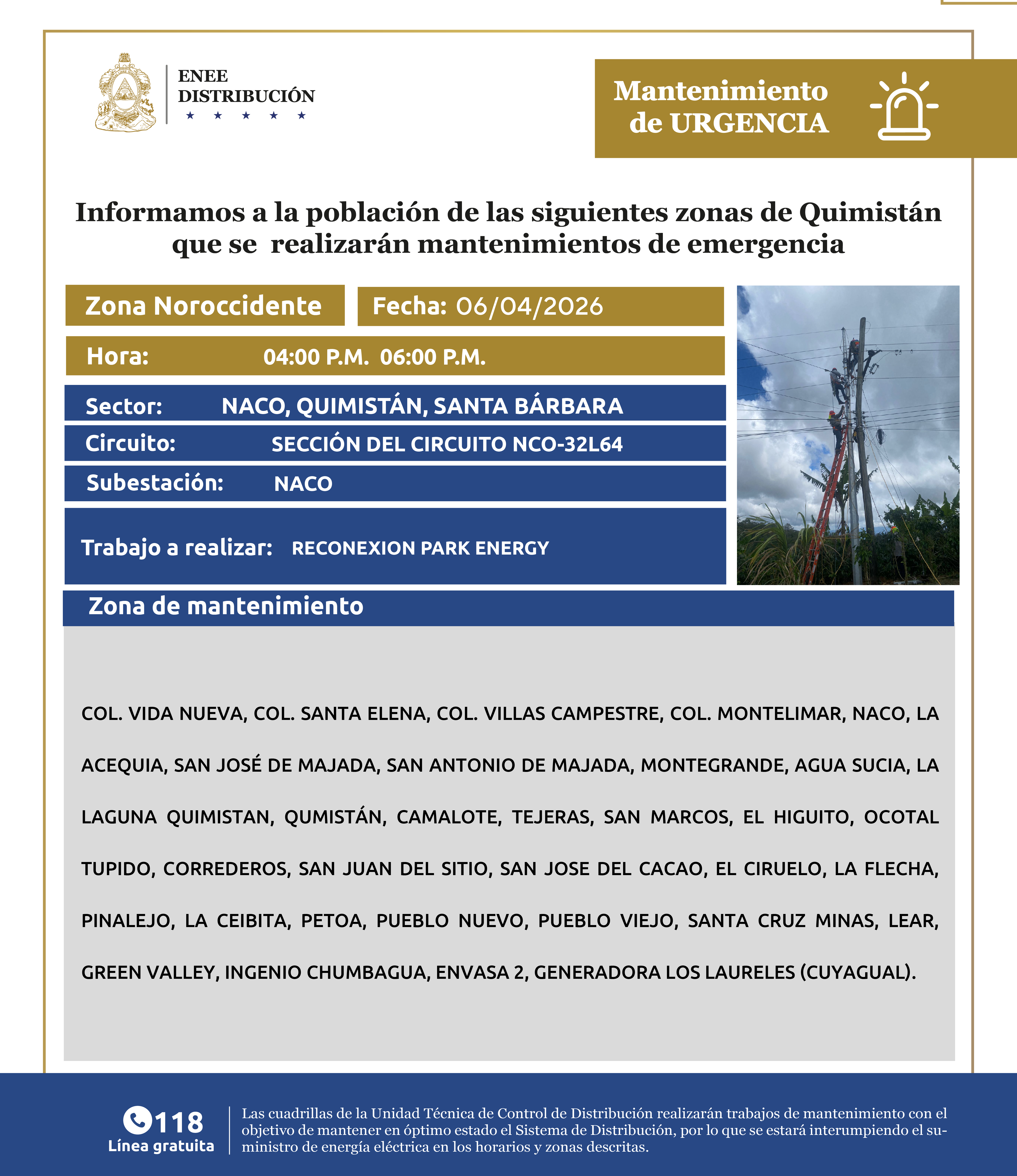 Avisos de Mantenimiento Emergencia - Noroccidente Quimistán lunes 06 de abril de 2026