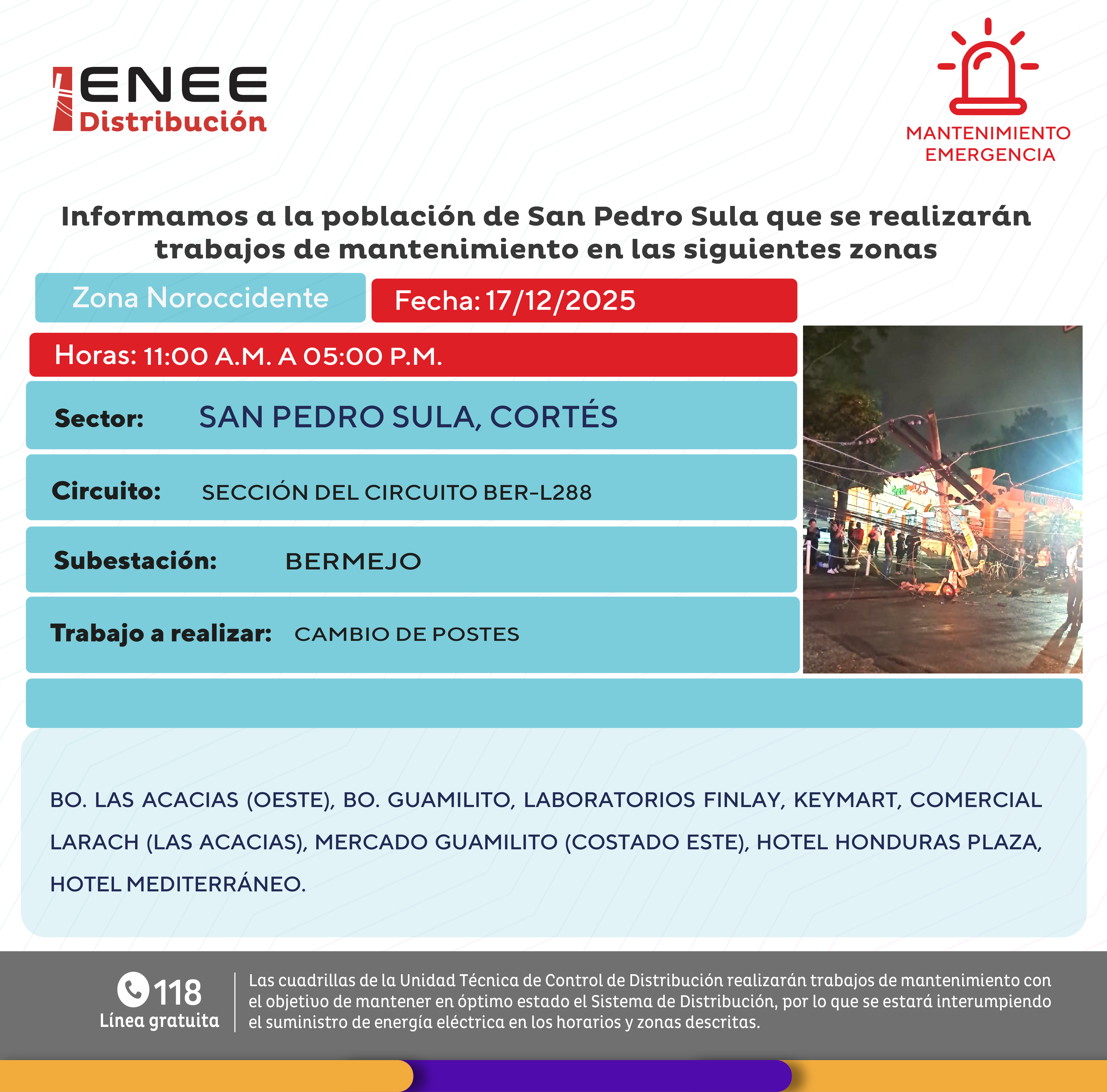 Avisos de Mantenimiento Emergencia - Noroccidente San Pedro Sula jueves 17 de diciembre de 2025