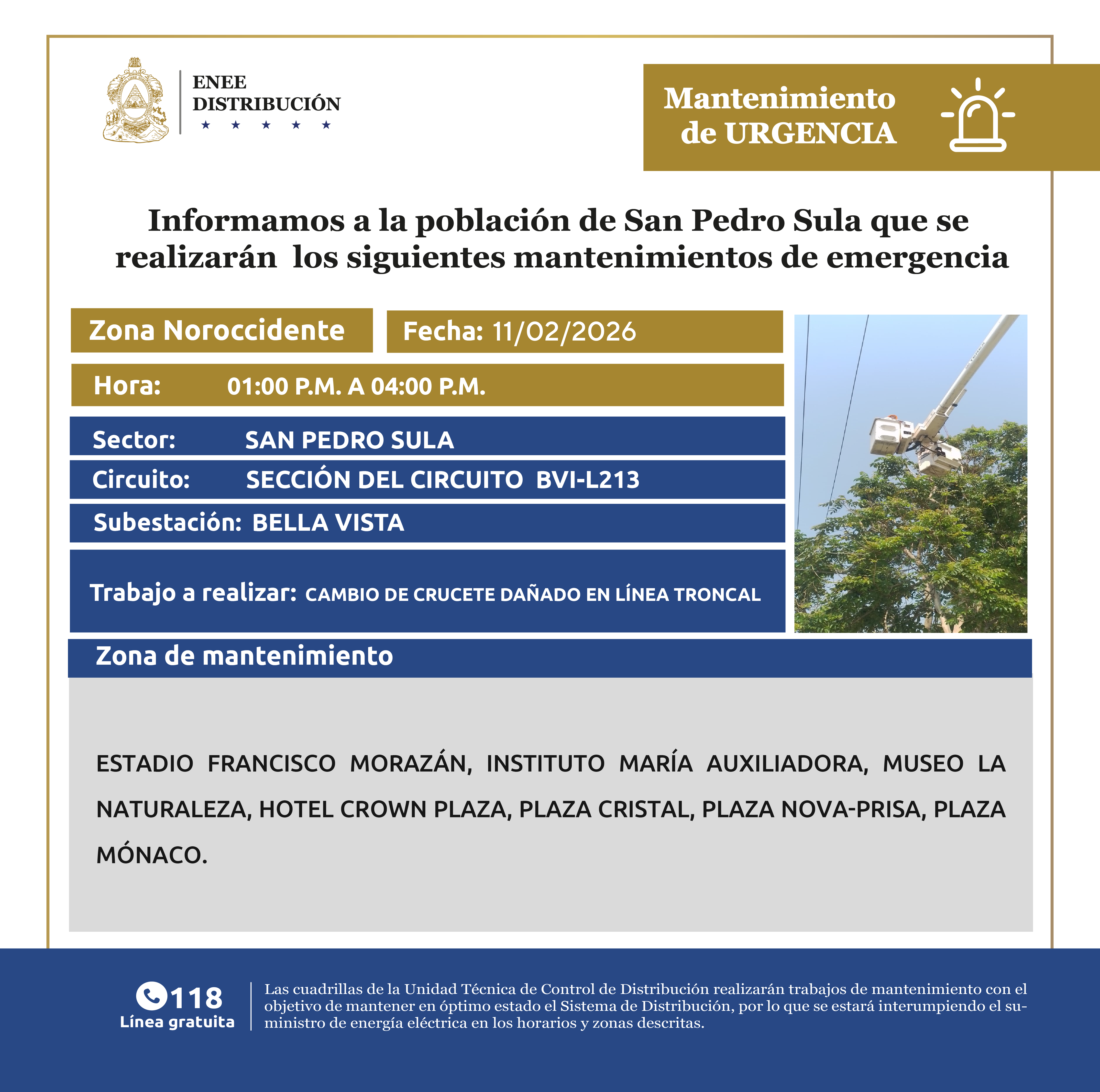 Avisos de Mantenimiento Emergencia- Noroccidente San Pedro Sula miércoles 11 de febrero de 2026