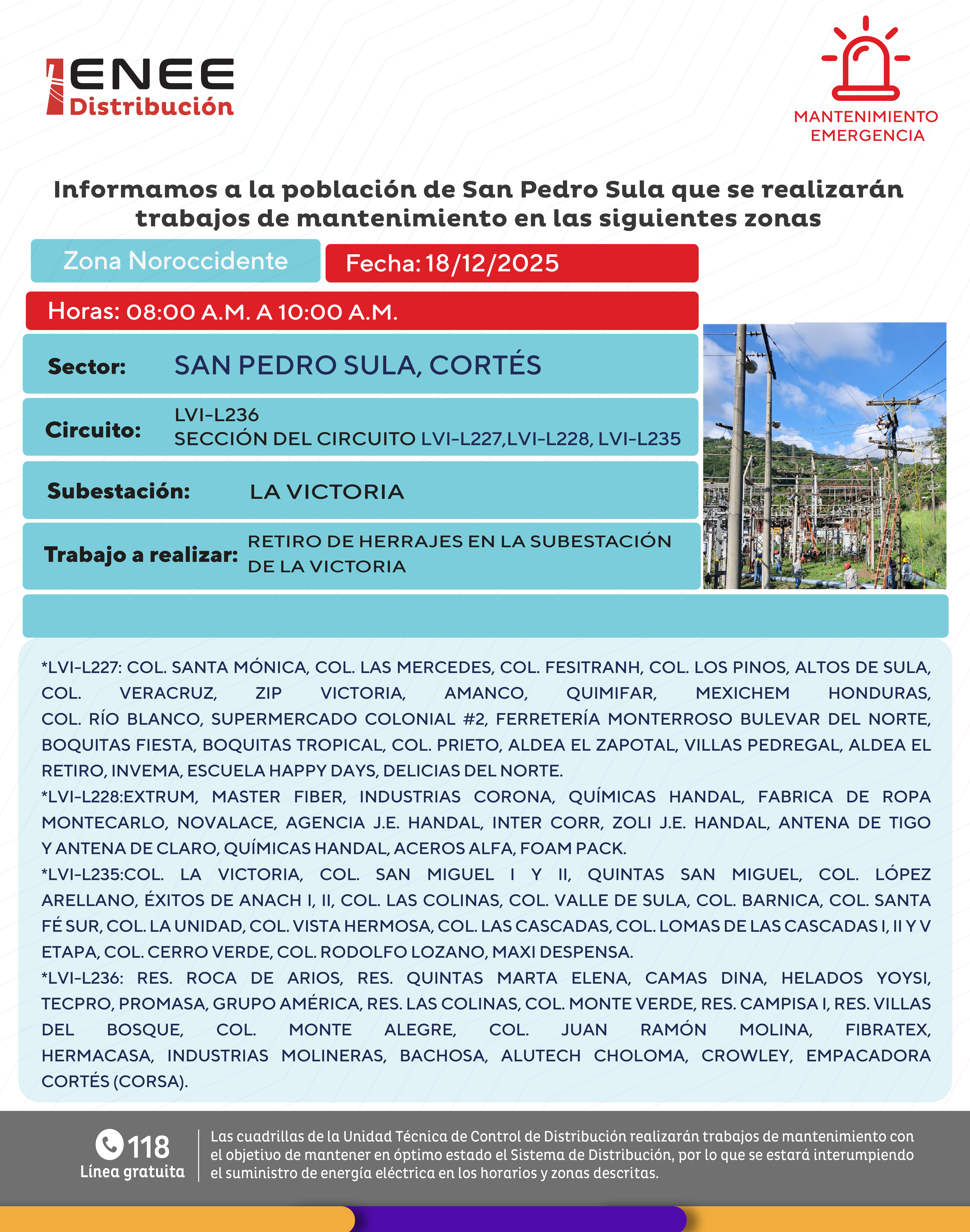 Avisos de Mantenimiento Emergencia - Noroccidente San Pedro Sula viernes 18 de diciembre de 2025