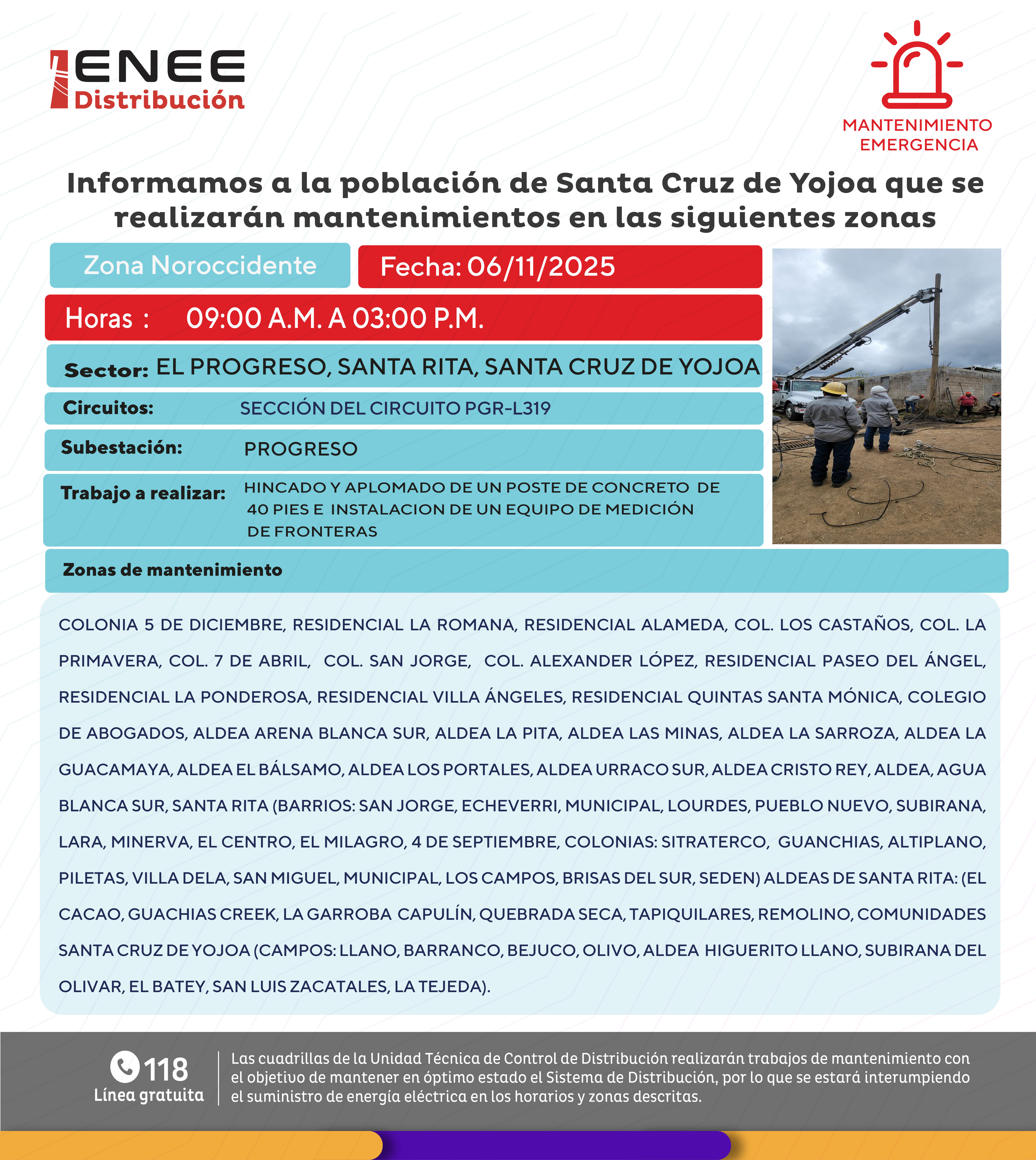 Avisos de Mantenimiento Emergencia - Noroccidente Santa Cruz de Yojoa jueves 06 noviembre de 2025