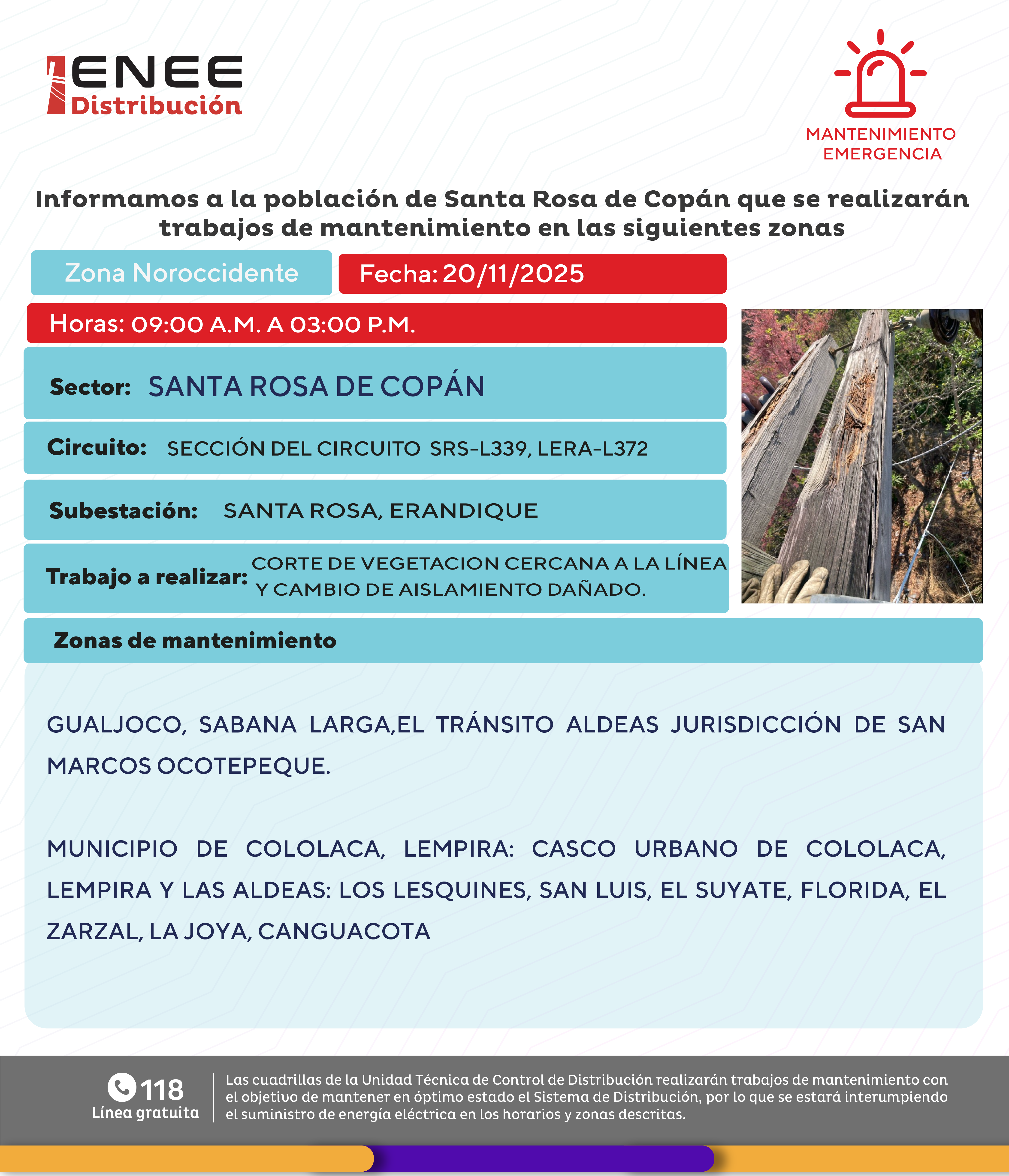 Avisos de Mantenimiento Emergencia - Noroccidente Santa Rosa de Copán jueves 20 noviembre de 2025