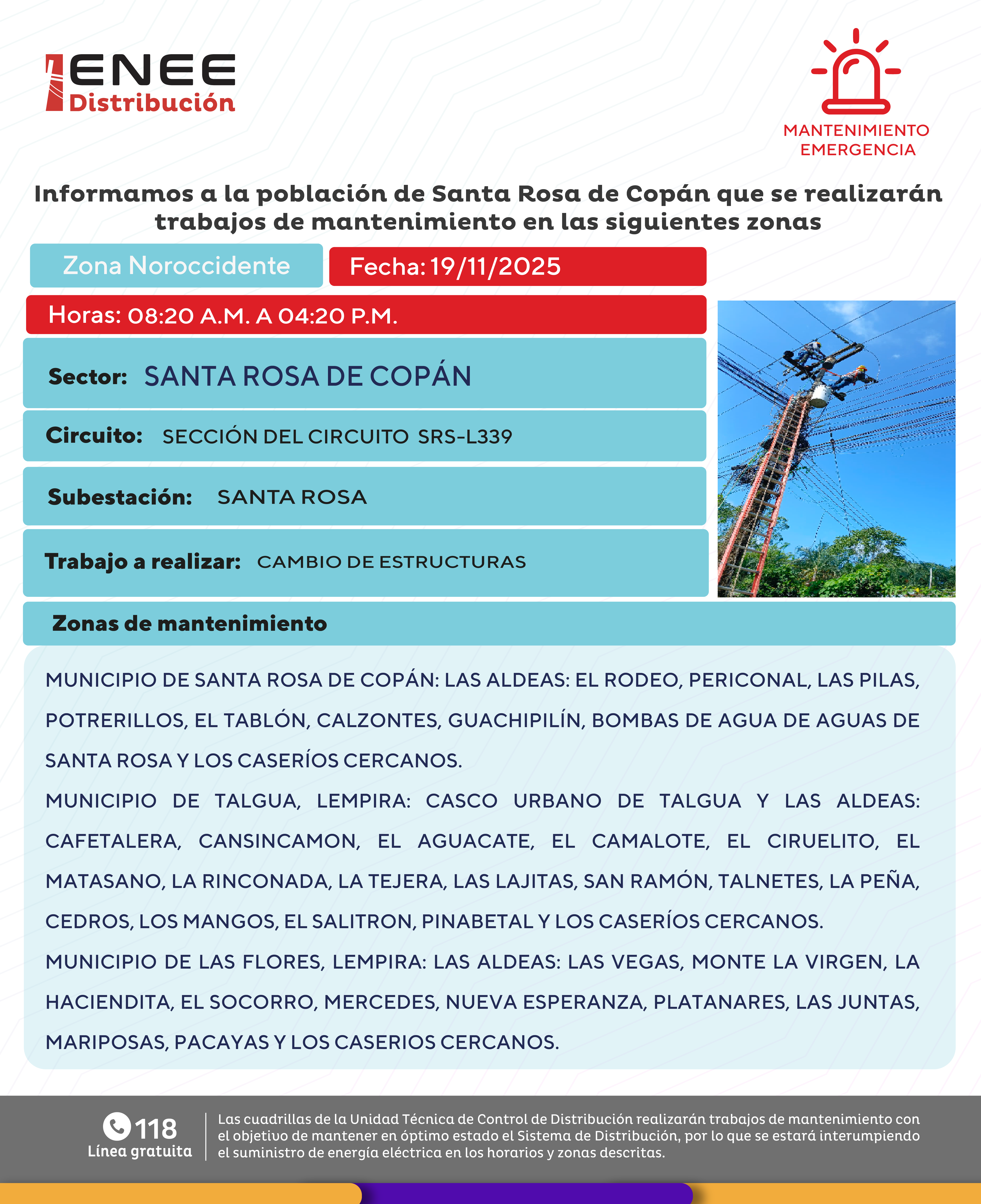 Avisos de Mantenimiento Emergencia - Noroccidente Santa Rosa de Copán miércoles 19 noviembre de 2025