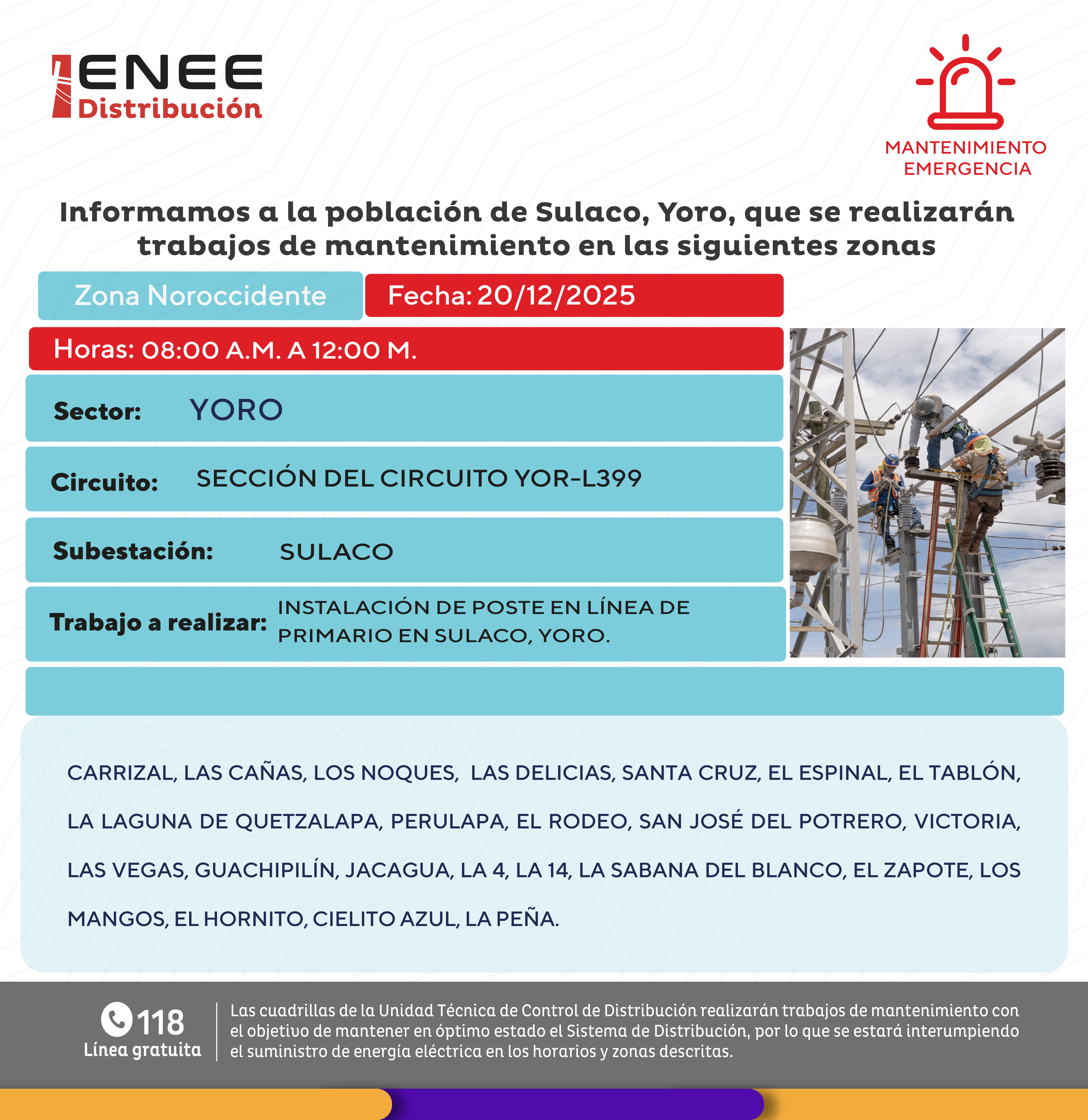 Avisos de Mantenimiento Emergencia - Noroccidente Sulaco, Yoro sábado 20 de diciembre de 2025