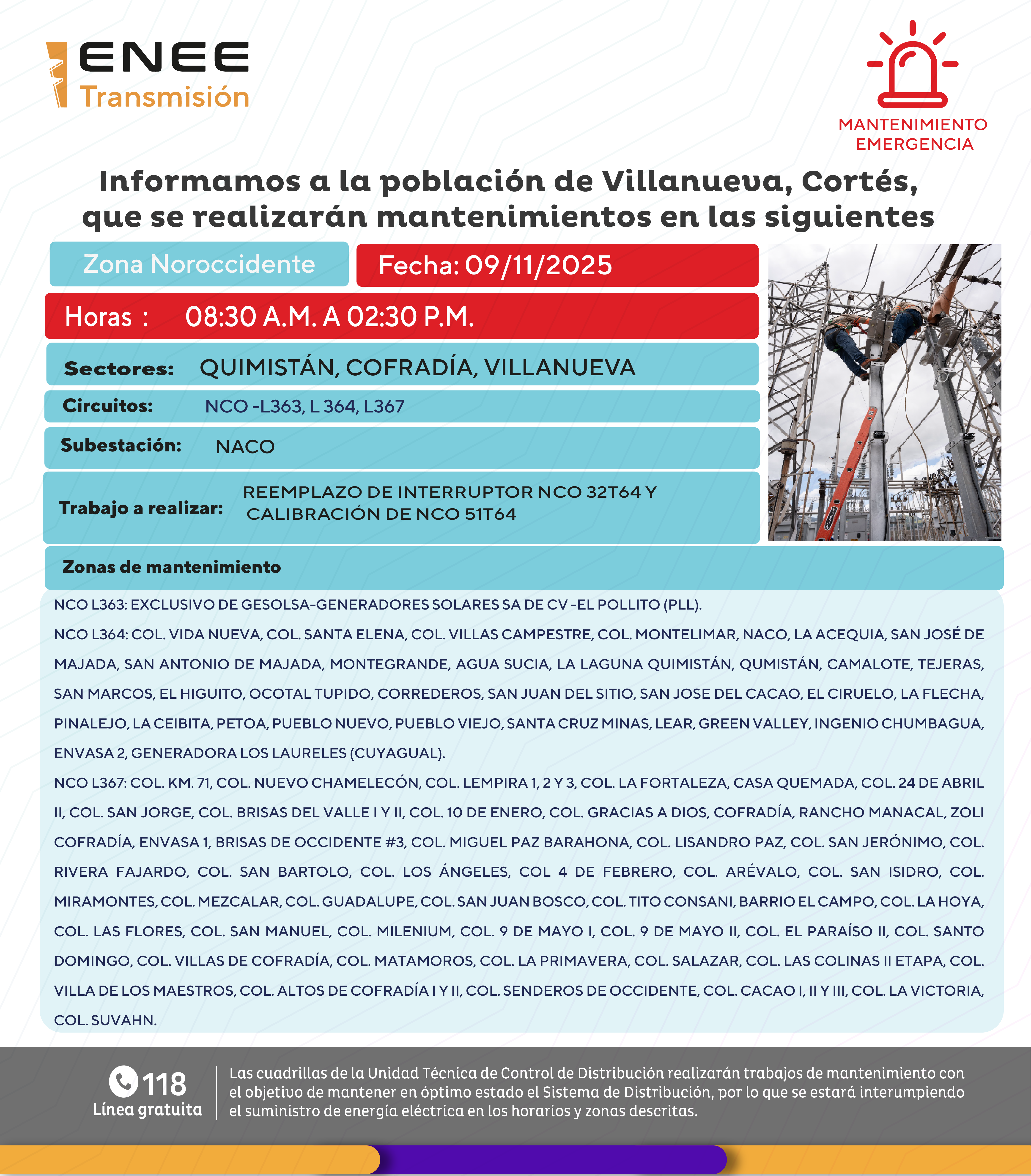 Avisos de Mantenimiento Emergencia - Noroccidente Villanueva, Cortés domingo 09 noviembre de 2025