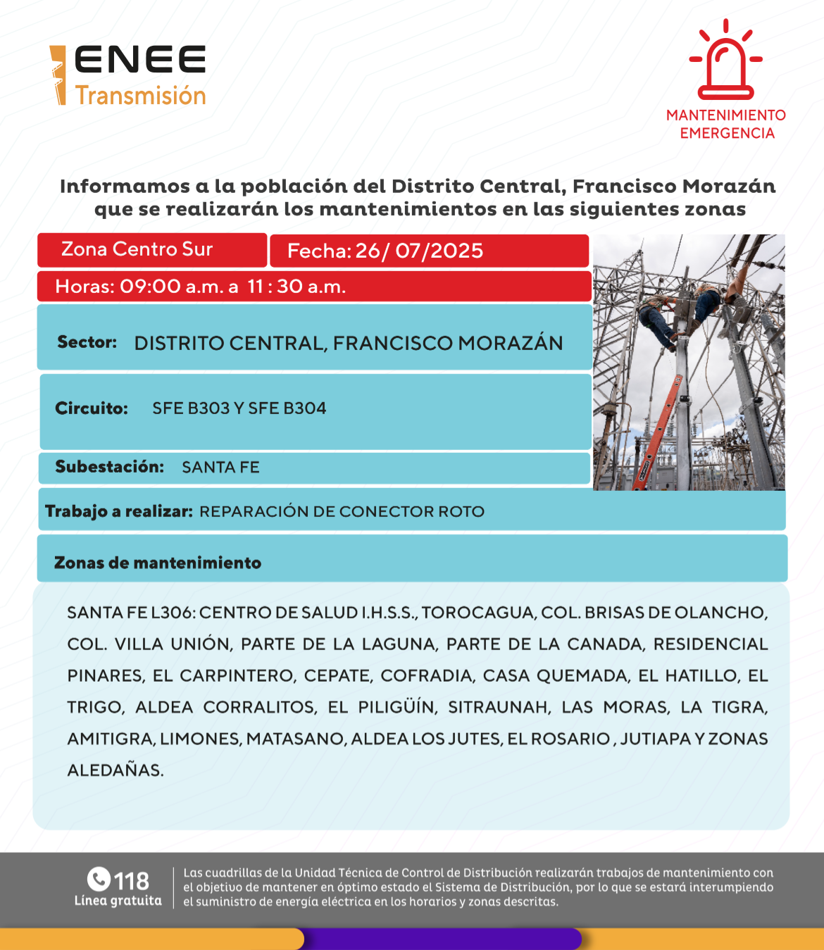 Avisos de Mantenimiento Emergencia TRANSMISIÓN - Zona Centro Sur sábado 26 de julio de 2025