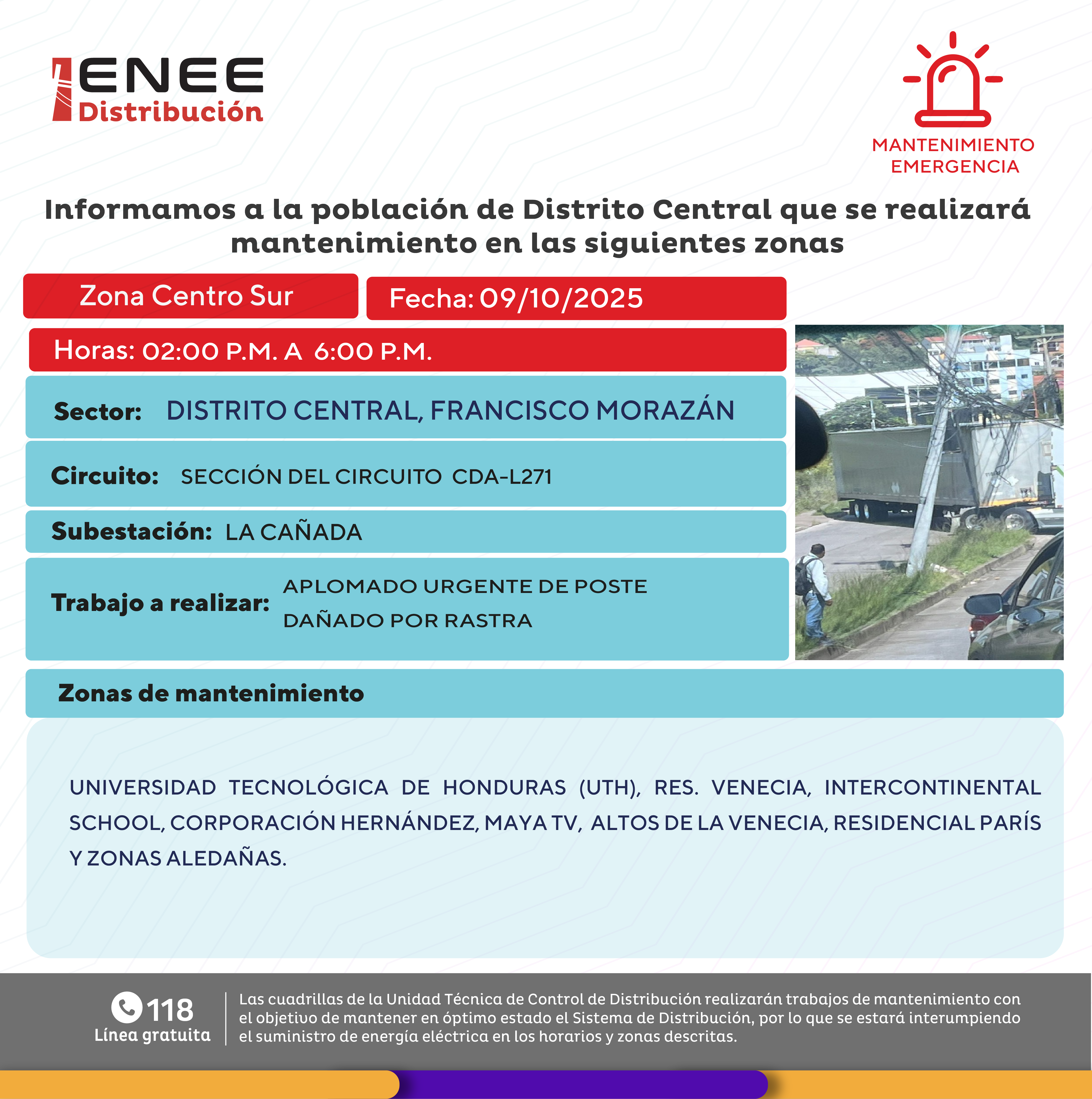 Avisos de Mantenimiento Emergencia - Zona Centro Sur Distrito Central jueves 09 de octubre de 2025