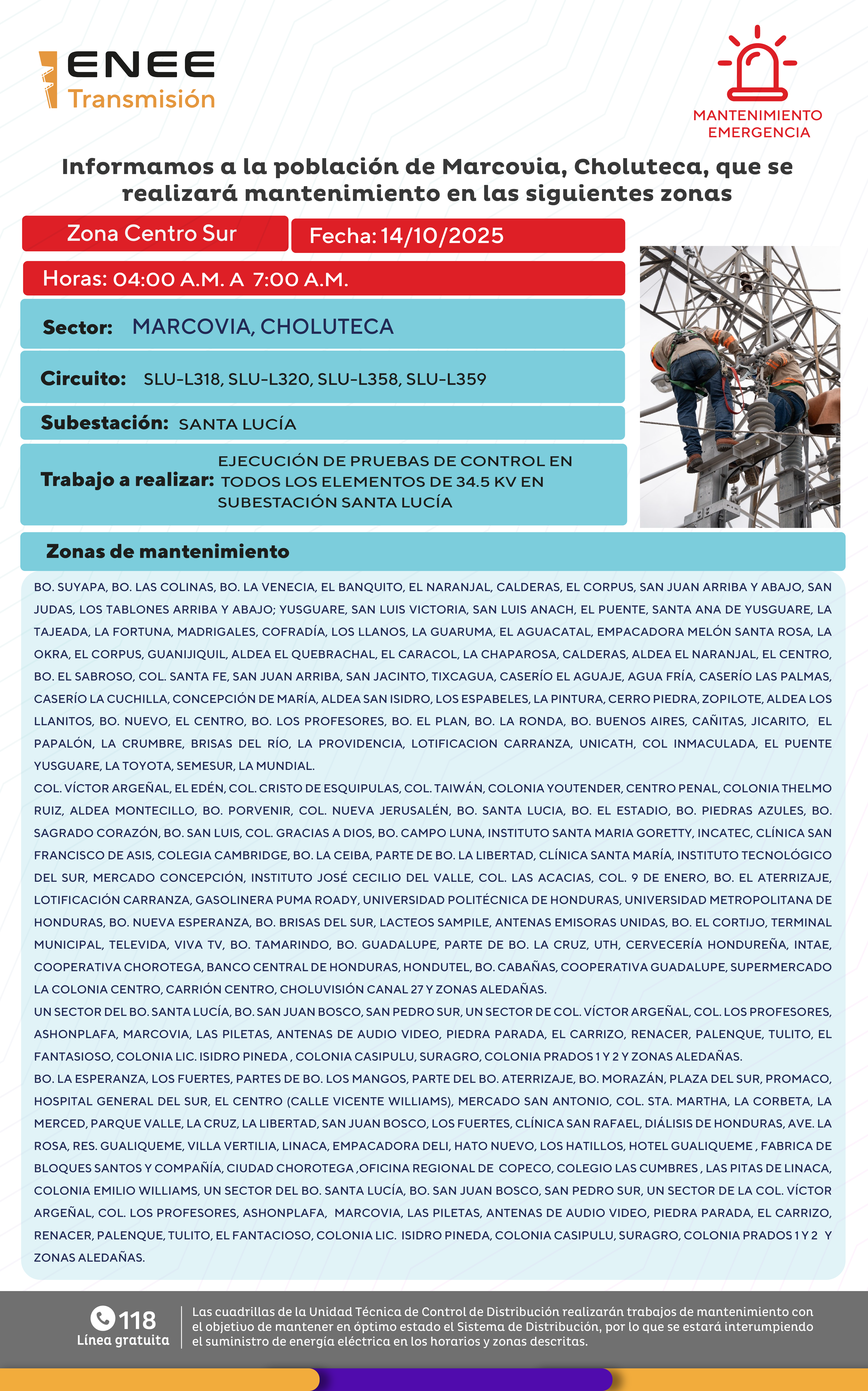 Avisos de Mantenimiento Emergencia - Zona Centro Sur Marcovia martes 14 de octubre de 2025