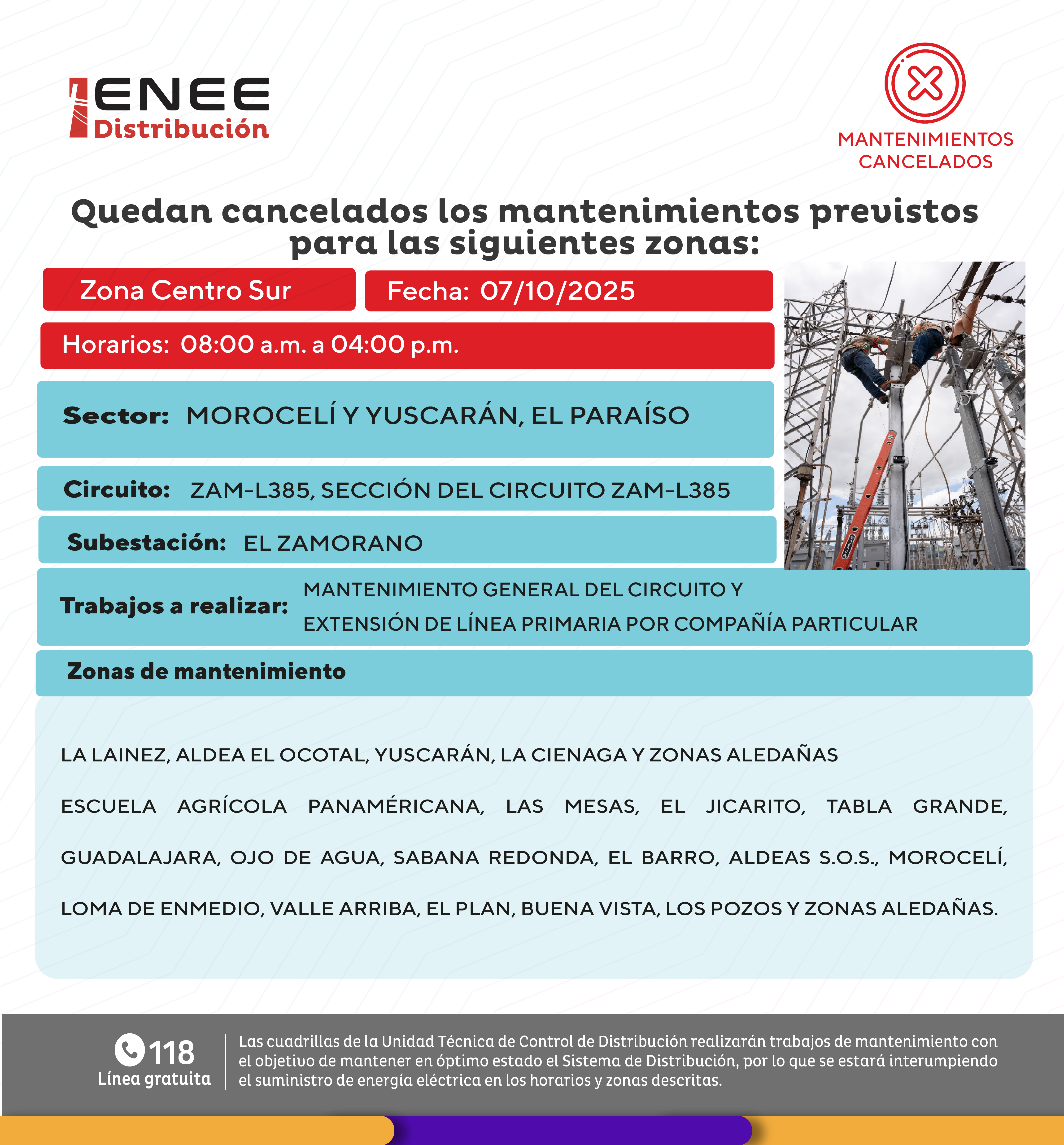 Avisos de Mantenimiento Emergencia - Zona Centro Sur Morocelí, Yuscarán martes 07 de octubre de 2025