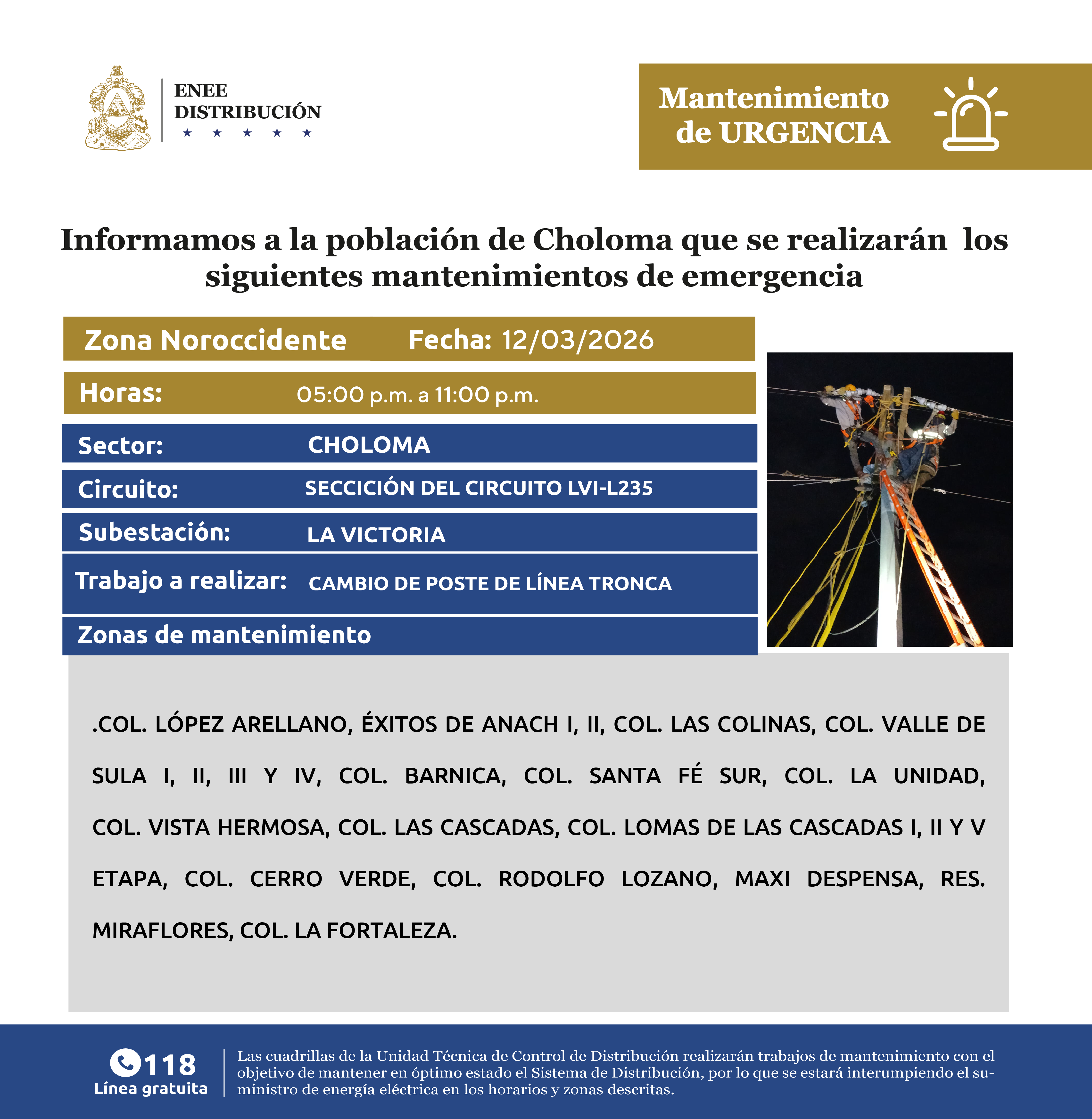 Avisos de Mantenimiento Emergencia - Zona Noroccidente Choloma jueves 12 de marzo de 2026