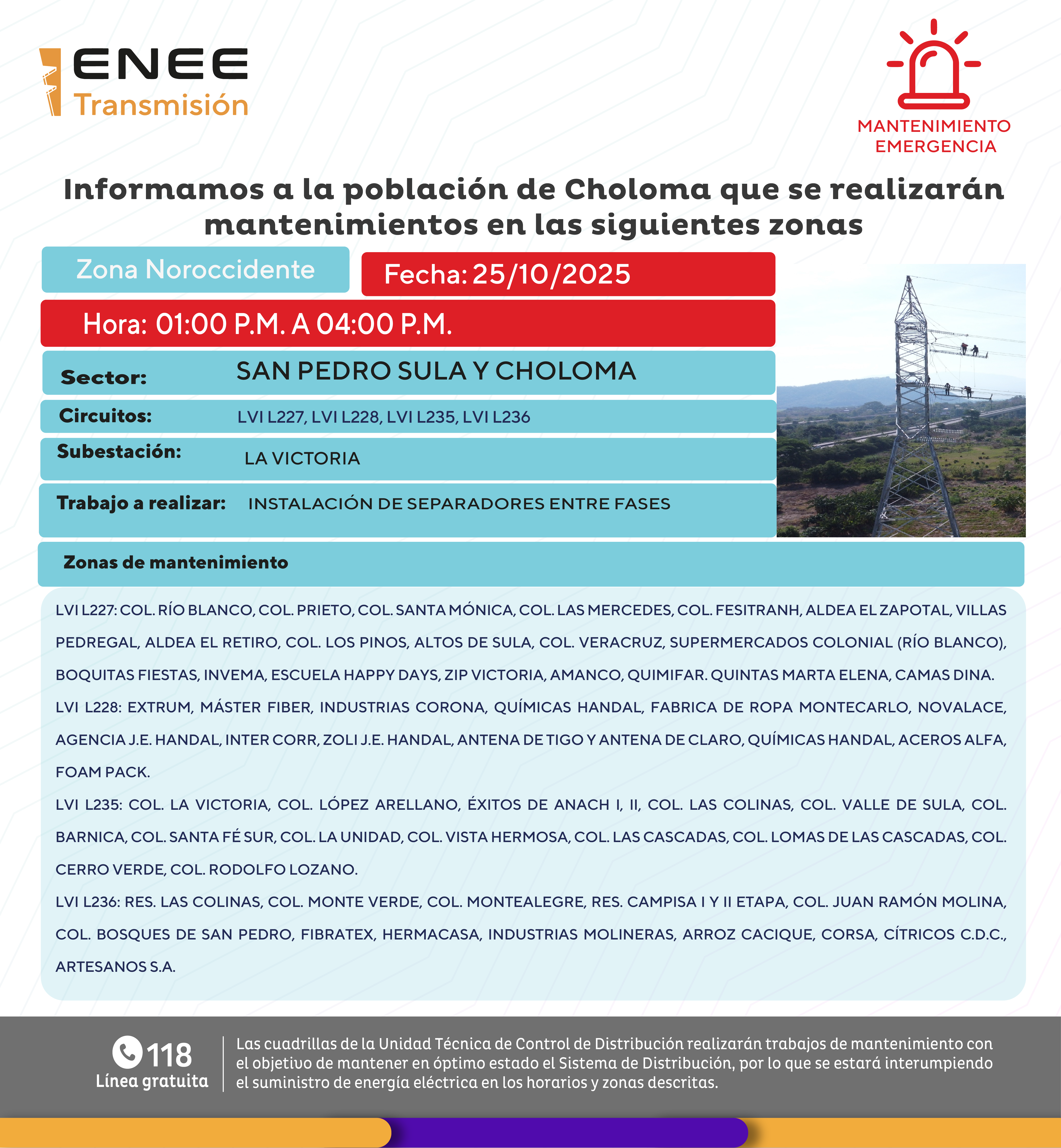 Avisos de Mantenimiento Emergencia - Zona Noroccidente Choloma sábado 25 de octubre de 2025