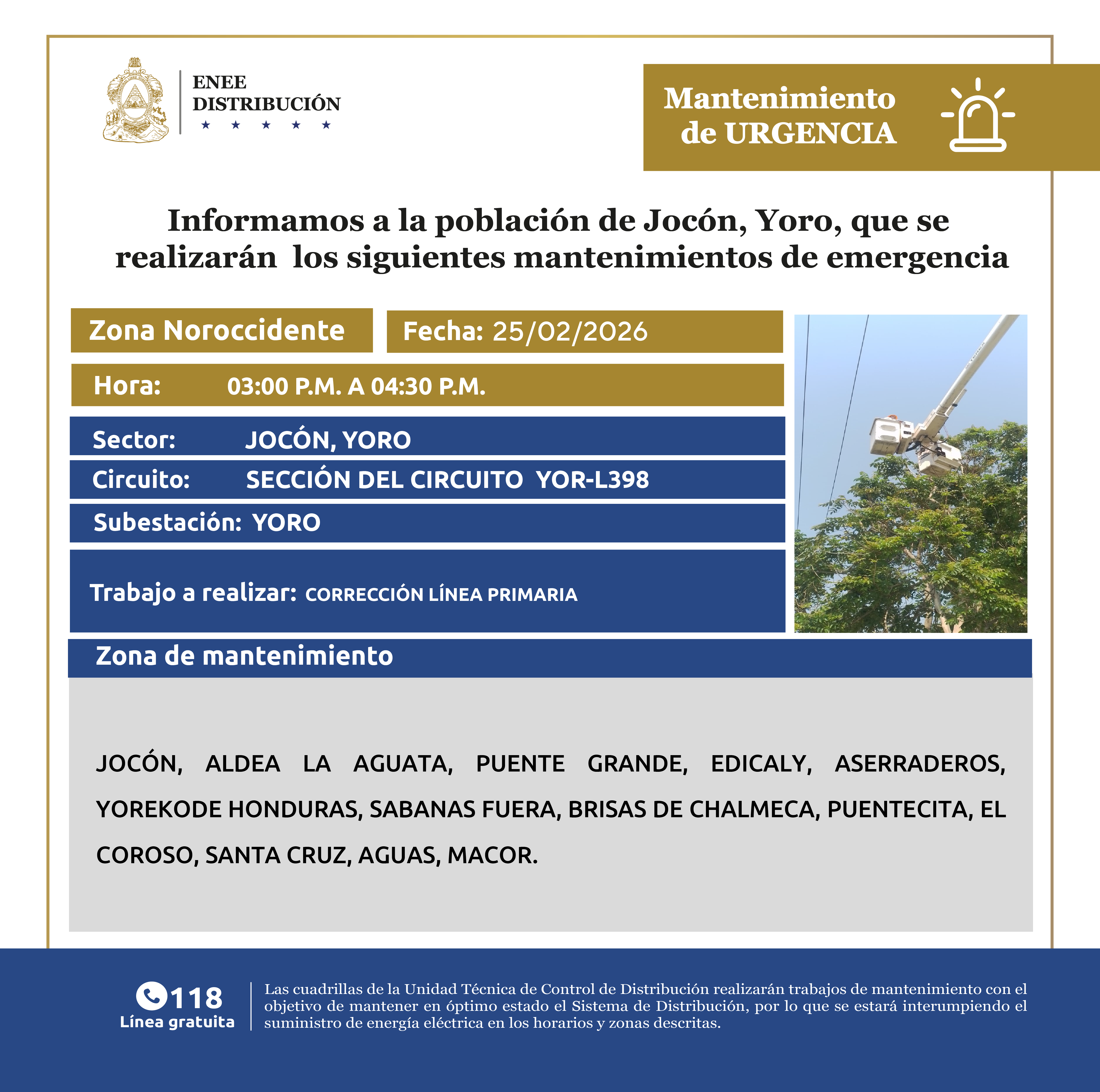 Avisos de Mantenimiento Emergencia - Zona Noroccidente Jocón, Yoro miércoles 25 de febrero de 2026
