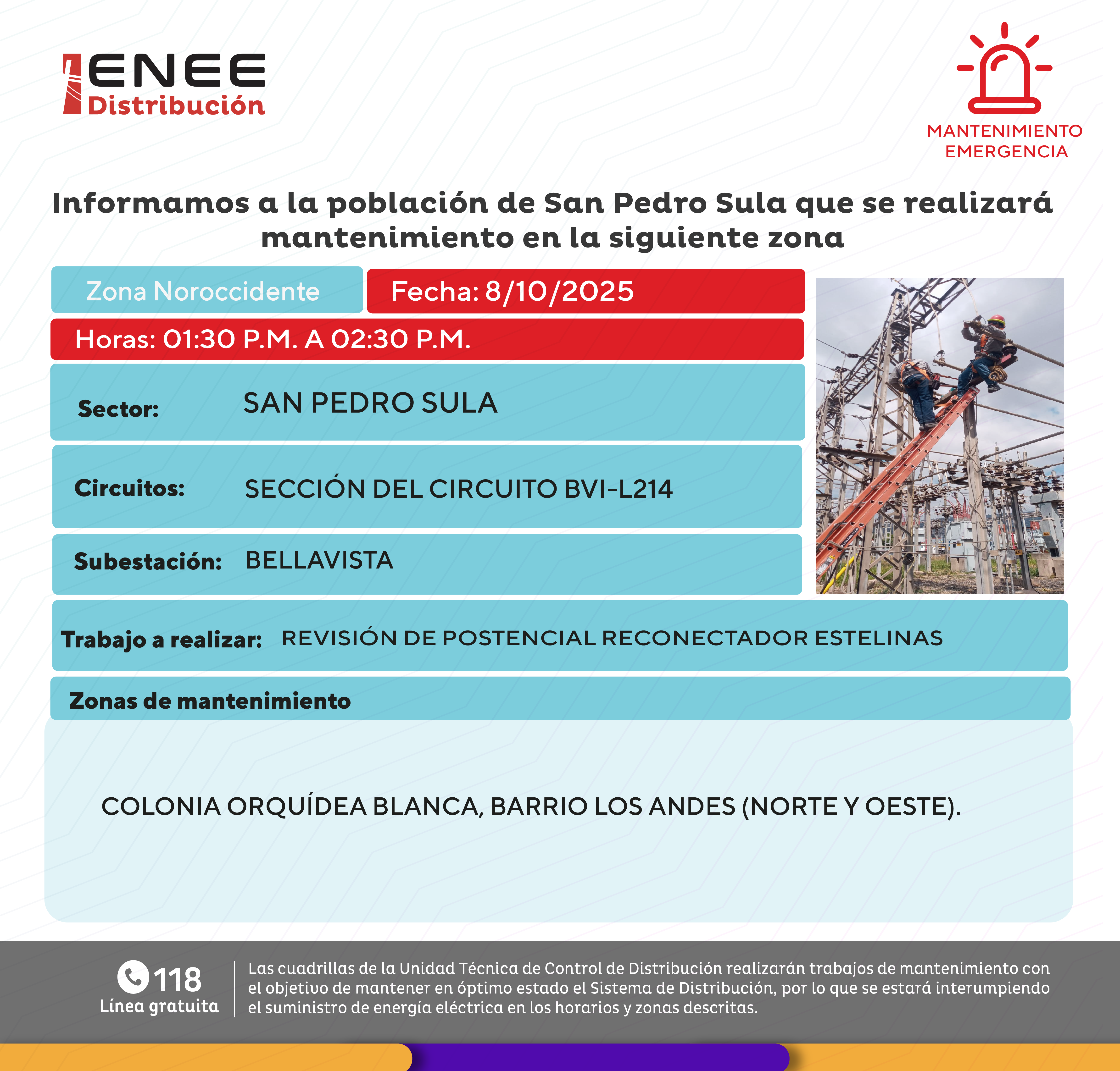 Avisos de Mantenimiento Emergencia - Zona Noroccidente San Pedro Sula miércoles 08 de octubre de 2025