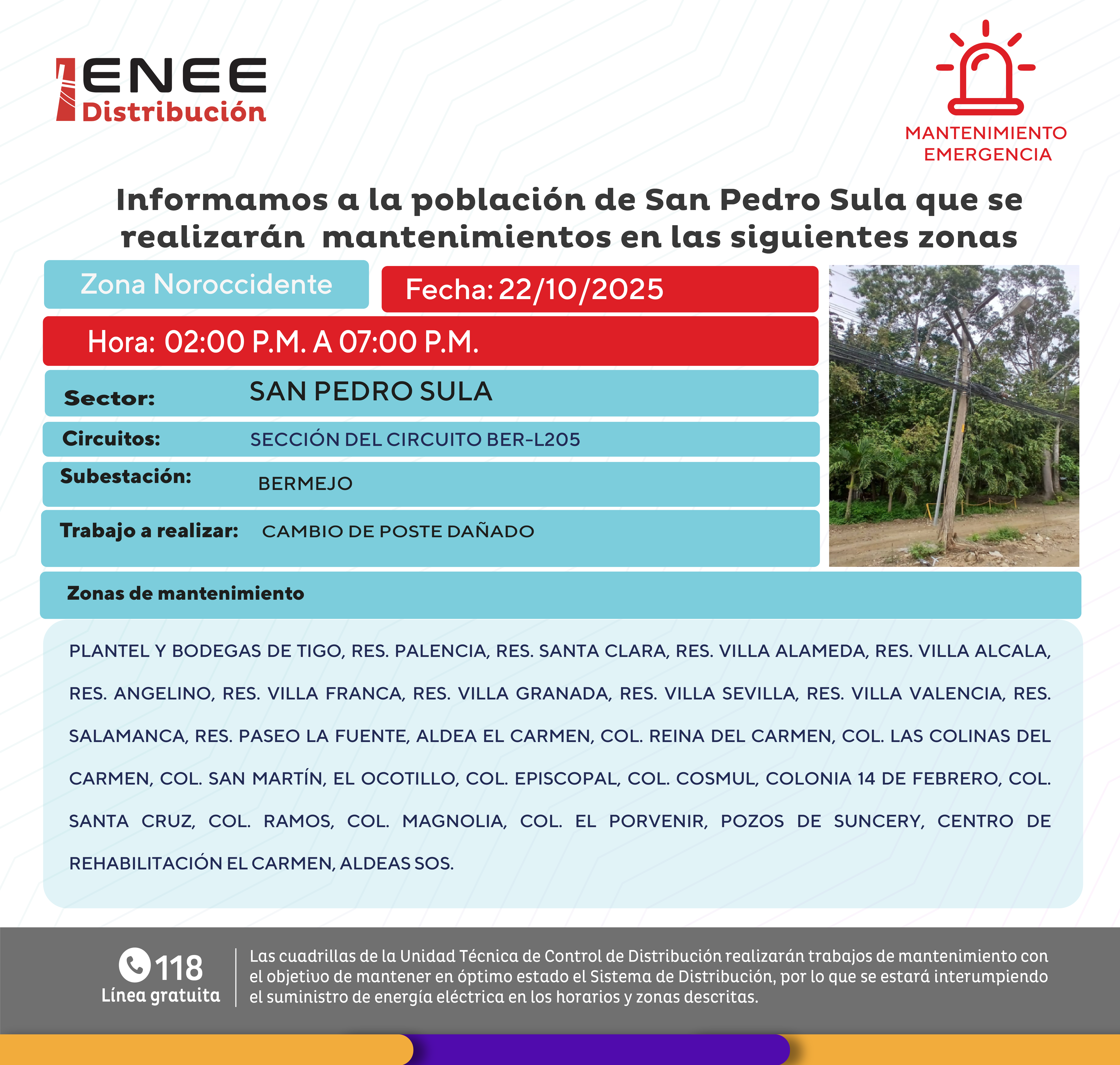 Avisos de Mantenimiento Emergencia - Zona Noroccidente San Pedro Sula miércoles 22 de octubre de 2025