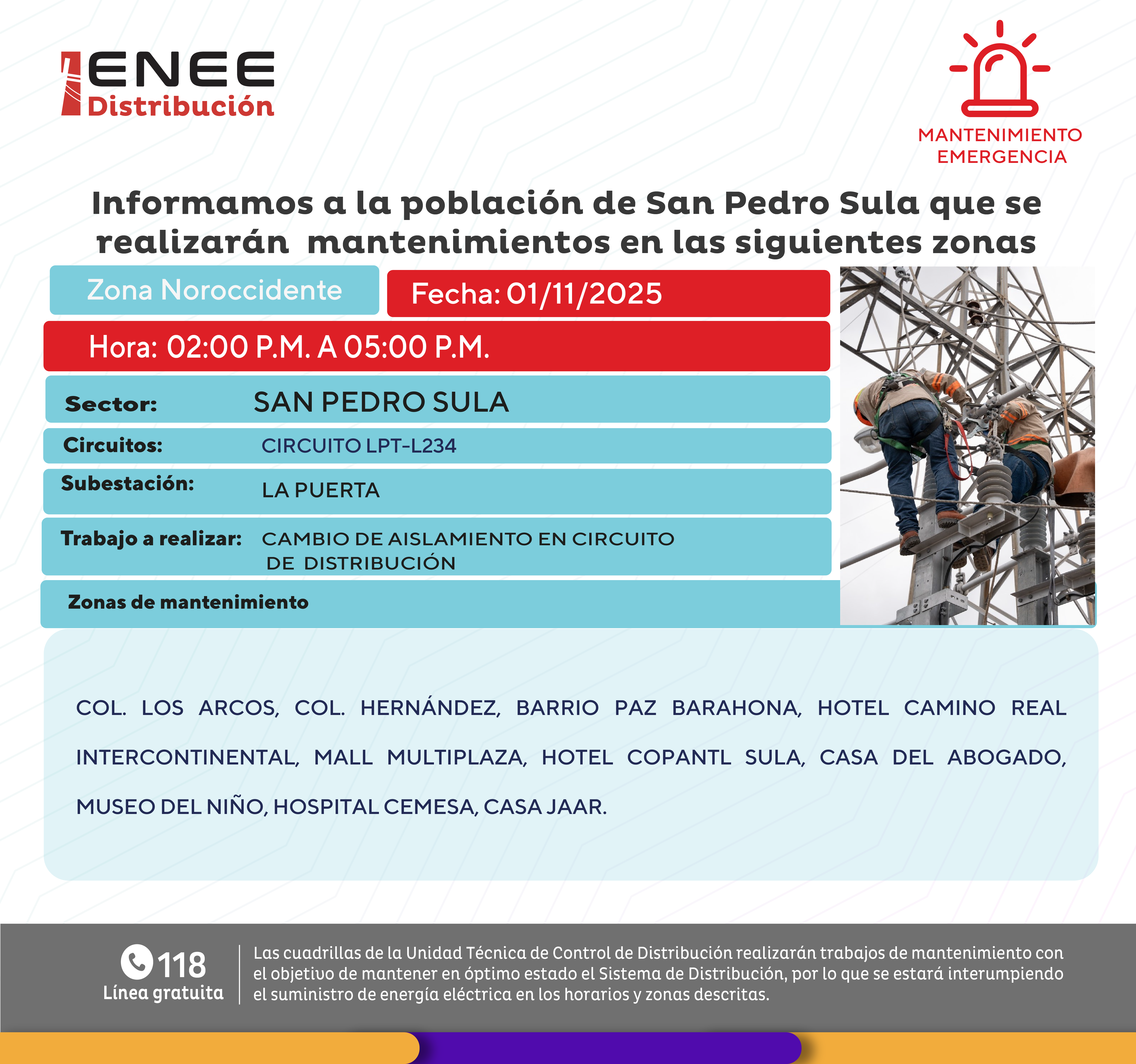 Avisos de Mantenimiento Emergencia - Zona Noroccidente San Pedro Sula sábado 01 de noviembre de 2025